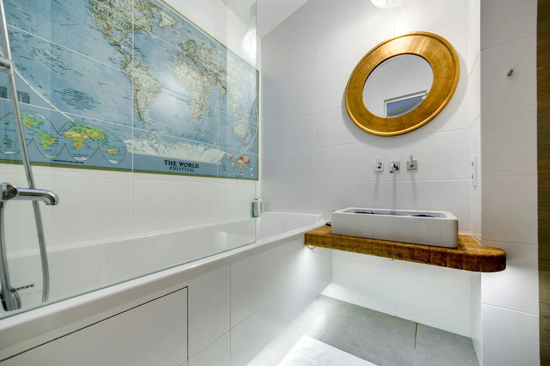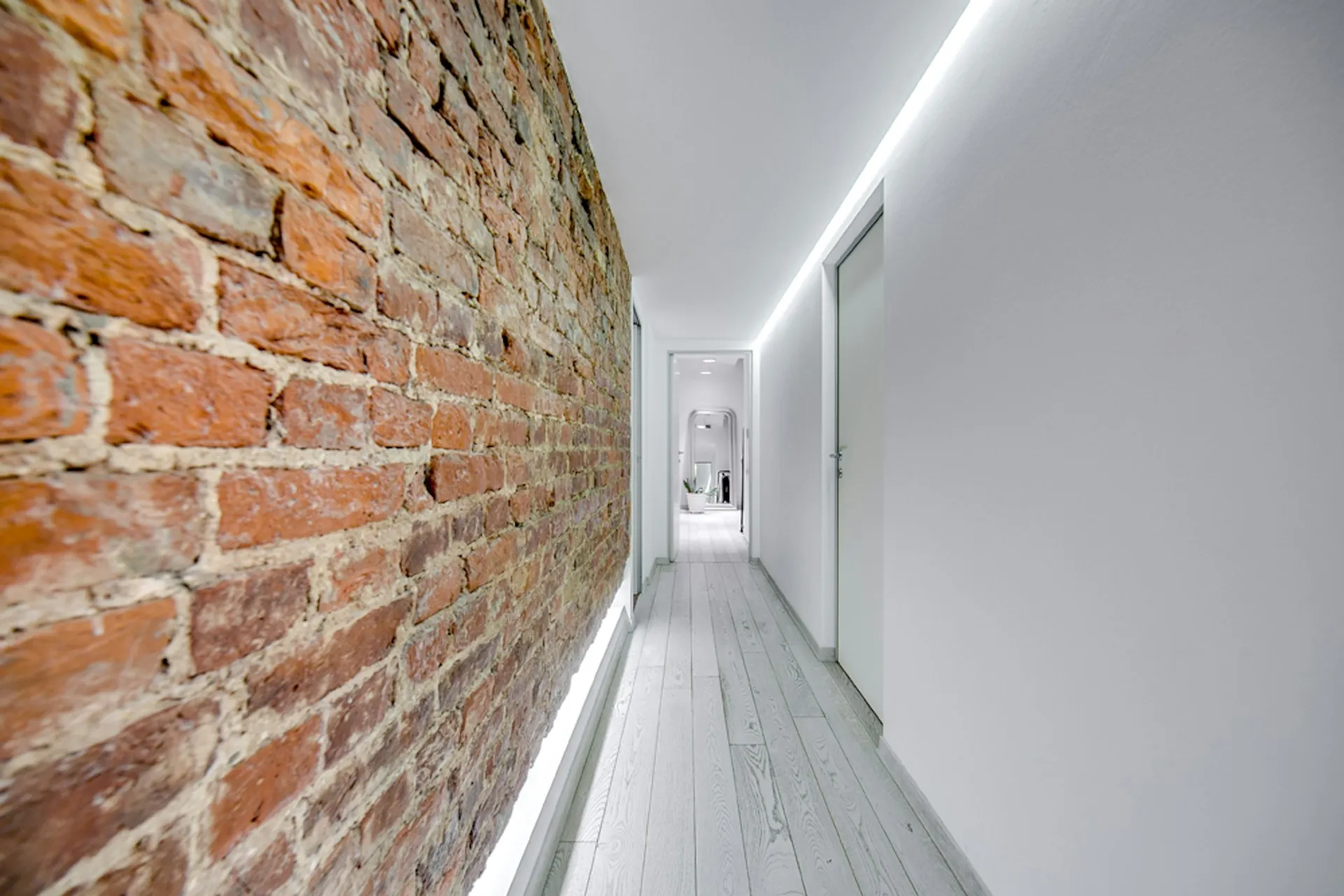 A bright loft apartment blending minimal structure with curated personal touches — from carefully chosen vintage chairs to rich leather furniture. Natural light pours through skylights, softening the contrast between sleek surfaces and authentic charm.