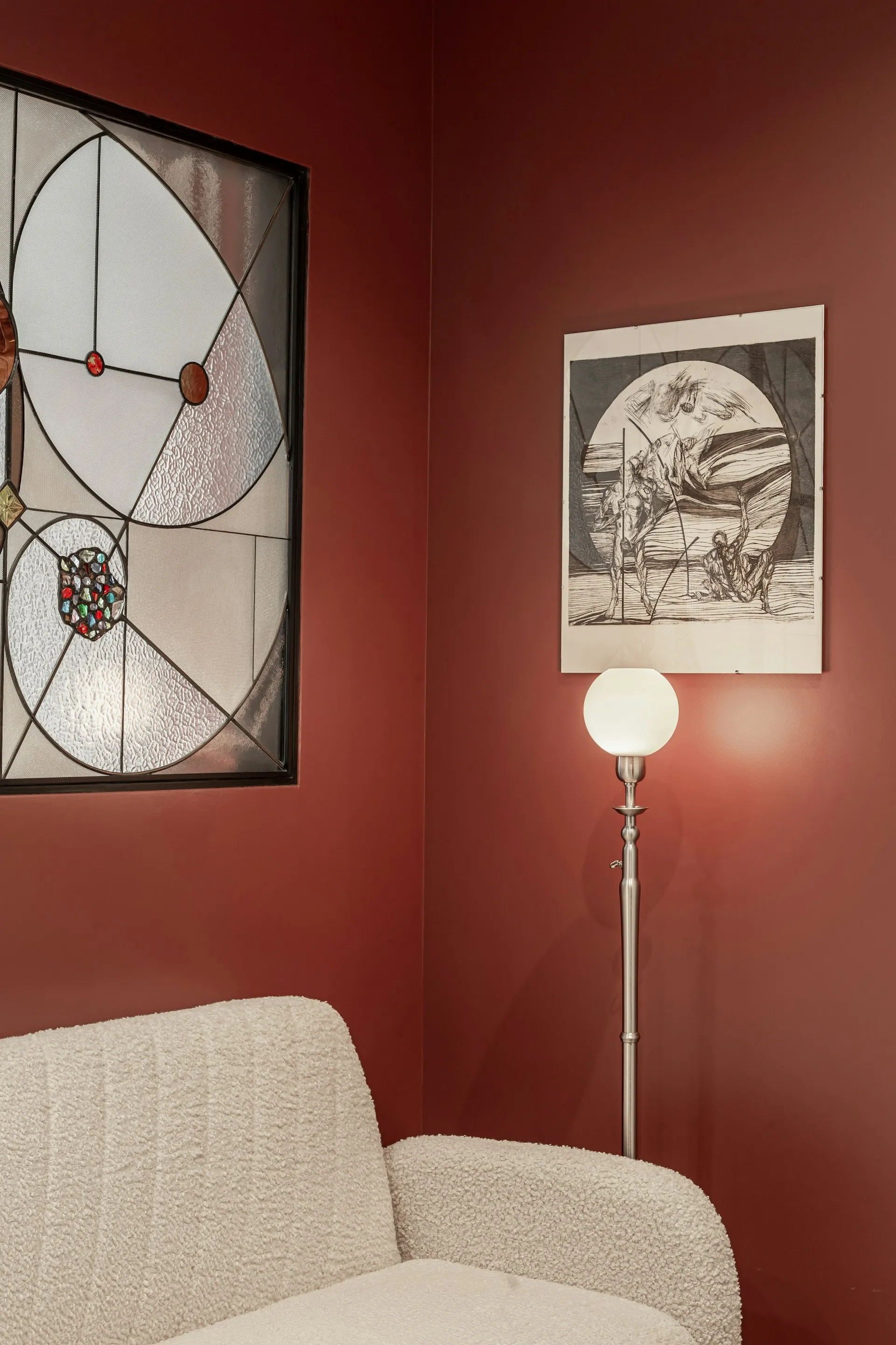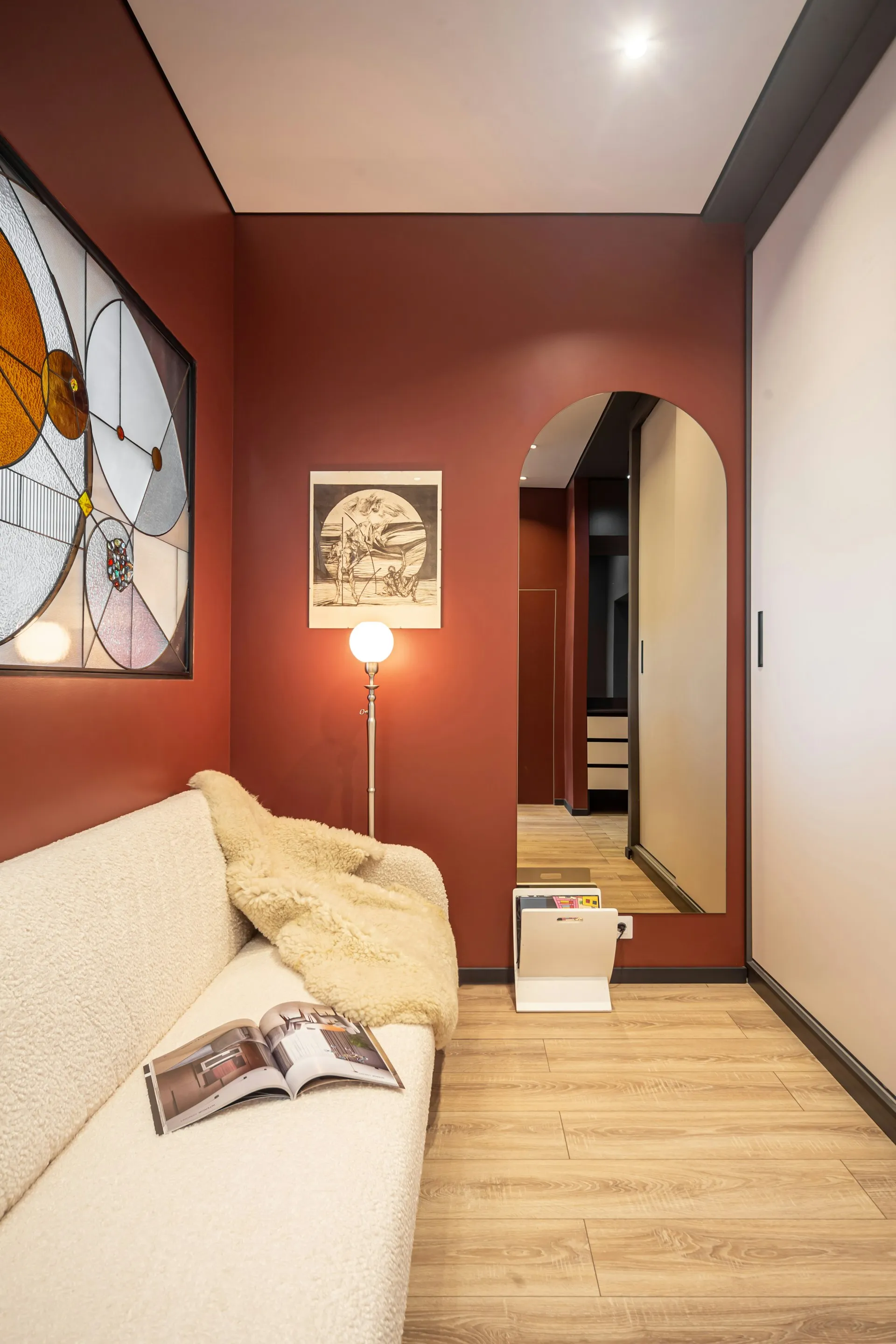 A warm and characterful apartment interior defined by terracotta red walls, clean modern lines, and cozy textures. This play of contrast between bold color and neutral tones gives the space both energy and calm—creating a home that feels both vibrant and deeply restful.